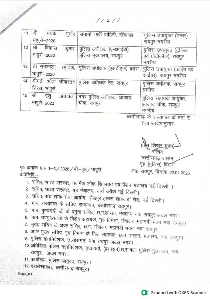 - श्वेता श्रीवास्तव सिन्हा को एसपी रेल रायपुर से हटाकर एसपी, रायपुर ग्रामीण बनाया गया है।