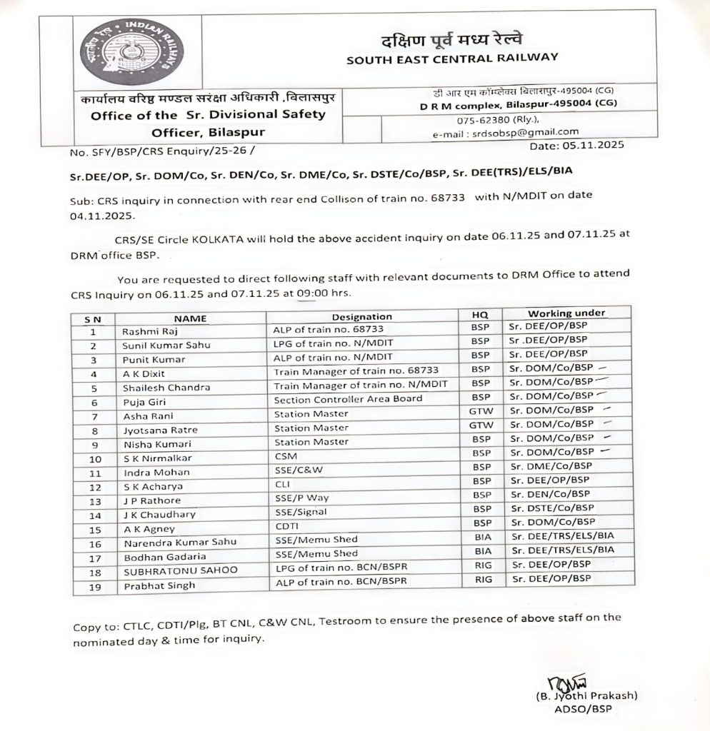 अब 6 और 7 नवंबर को बिलासपुर DRM कार्यालय में पूछताछ होगी, जिसमें करीब 19 रेलवे कर्मचारी और अधिकारी दस्तावेजों सहित तलब किए गए हैं।