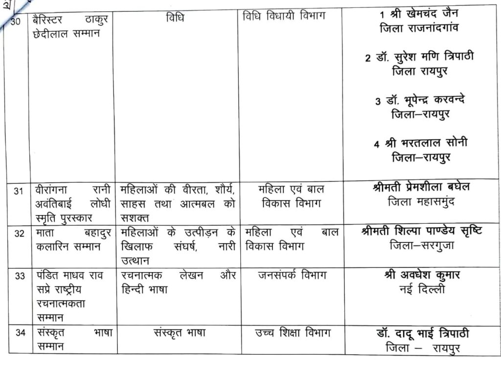 • मिनीमाता सम्मानललेश्वरी साहू (महिला एवं बाल विकास के लिए)