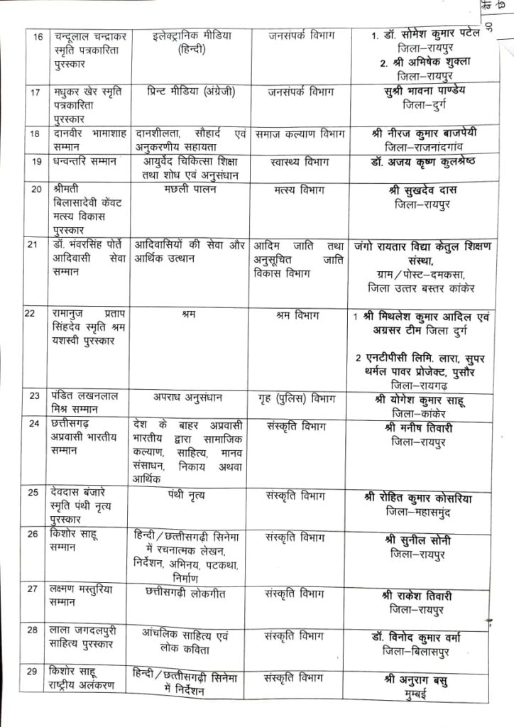 राज्य के संस्कृति मंत्री राजेश अग्रवाल ने बुधवार को मीडिया से चर्चा के दौरान अलंकरण प्राप्त करने वाले व्यक्तियों और संस्थाओं की सूची जारी की। बताया गया कि समारोह में देश के उप राष्ट्रपति सम्मान प्रदान करेंगे।