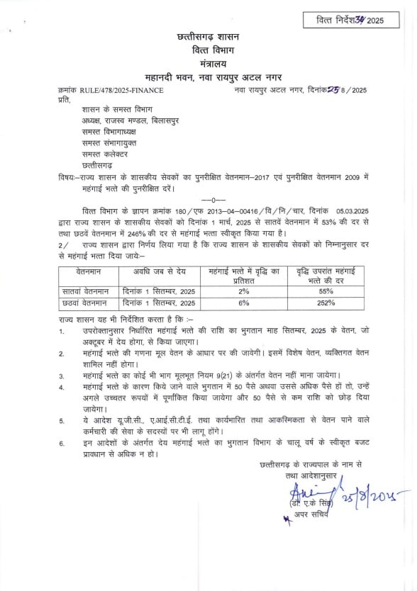 रायपुर. त्योहारी सीजन से पहले छत्तीसगढ़ सरकार ने शासकीय कर्मचारियों और अधिकारियों को बड़ा तोहफा दिया है। मुख्यमंत्री विष्णुदेव साहू के नेतृत्व वाली सरकार ने महंगाई भत्ते (DA) में 2% की वृद्धि करते हुए इसे 55 प्रतिशत कर दिया है। वित्त विभाग ने इस संबंध में आदेश भी जारी कर दिया है। यह बढ़ा हुआ भत्ता 1 सितंबर 2025 से प्रभावी होगा।