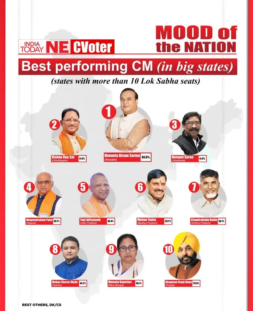 मध्य प्रदेश के मुख्यमंत्री मोहन यादव छठे नंबर पर रहे, जहां 39.2% जनता ने उनके काम पर मुहर लगाई।