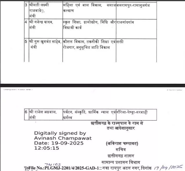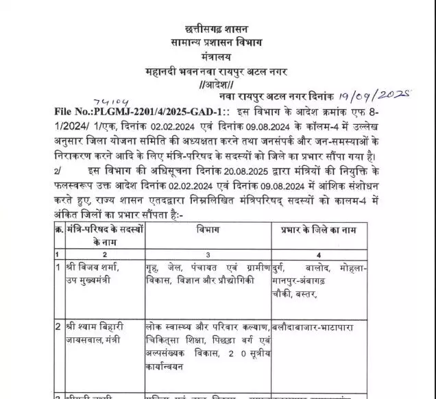 रायपुर। छत्तीसगढ़ में मंत्रिमंडल विस्तार के बाद अब मंत्रियों के जिलों के प्रभार में बड़ा फेरबदल किया गया है। सामान्य प्रशासन विभाग (GAD) ने शुक्रवार को इसका आदेश जारी कर दिया। नए आदेश के साथ ही मंत्रियों के जिम्मे अलग-अलग जिलों की कमान आ गई है।