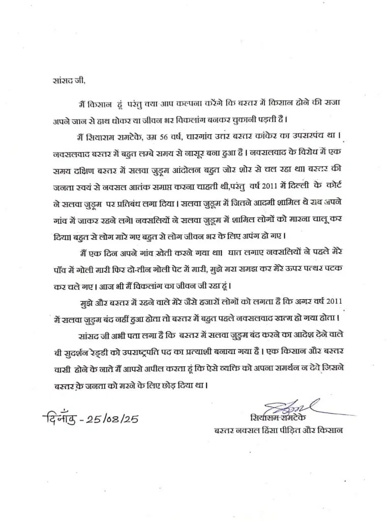 पीड़ित ने अपने पत्र में सांसदों से गुहार लगाई कि वे बस्तर के जख्मों को समझें और उस उम्मीदवार को समर्थन न दें, जिसने अपने फैसले से आम जनता को नक्सलियों के सामने असहाय कर दिया। उन्होंने लिखा कि विपक्ष के उपराष्ट्रपति पद के उम्मीदवार बी. सुदर्शन रेड्डी का समर्थन करना, बस्तर की जनता को एक बार फिर “मौत के हवाले करना” होगा।