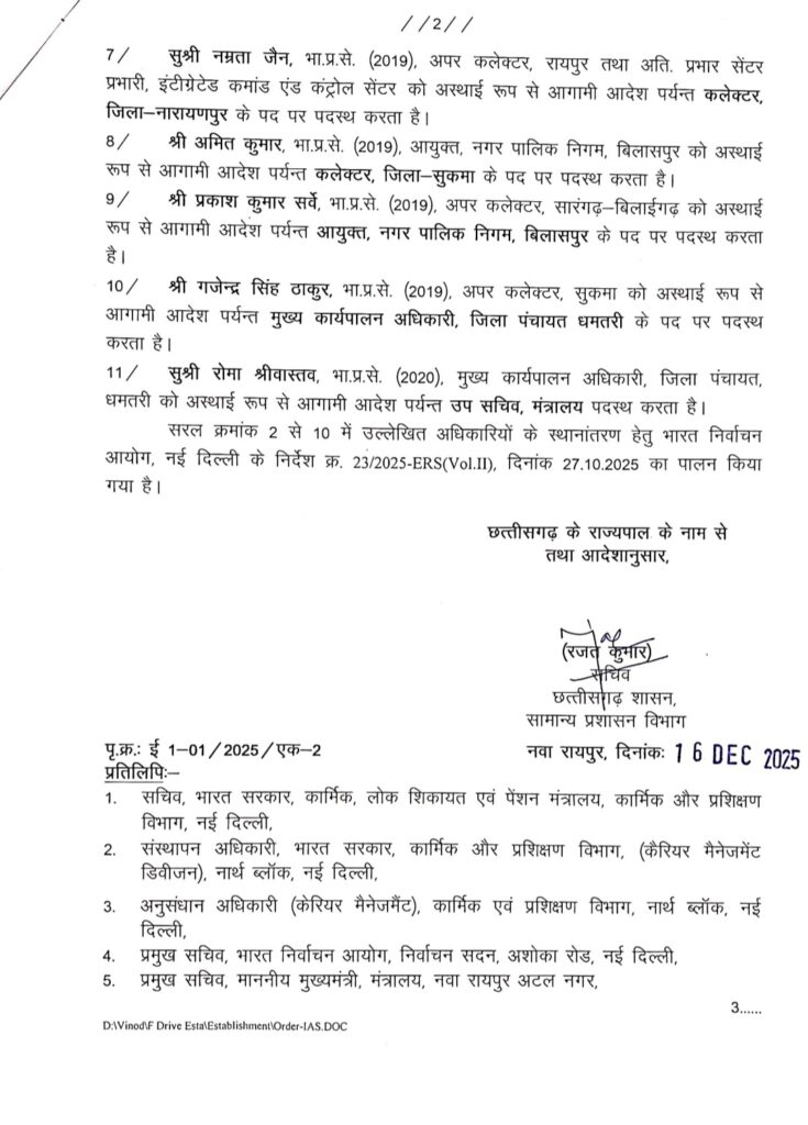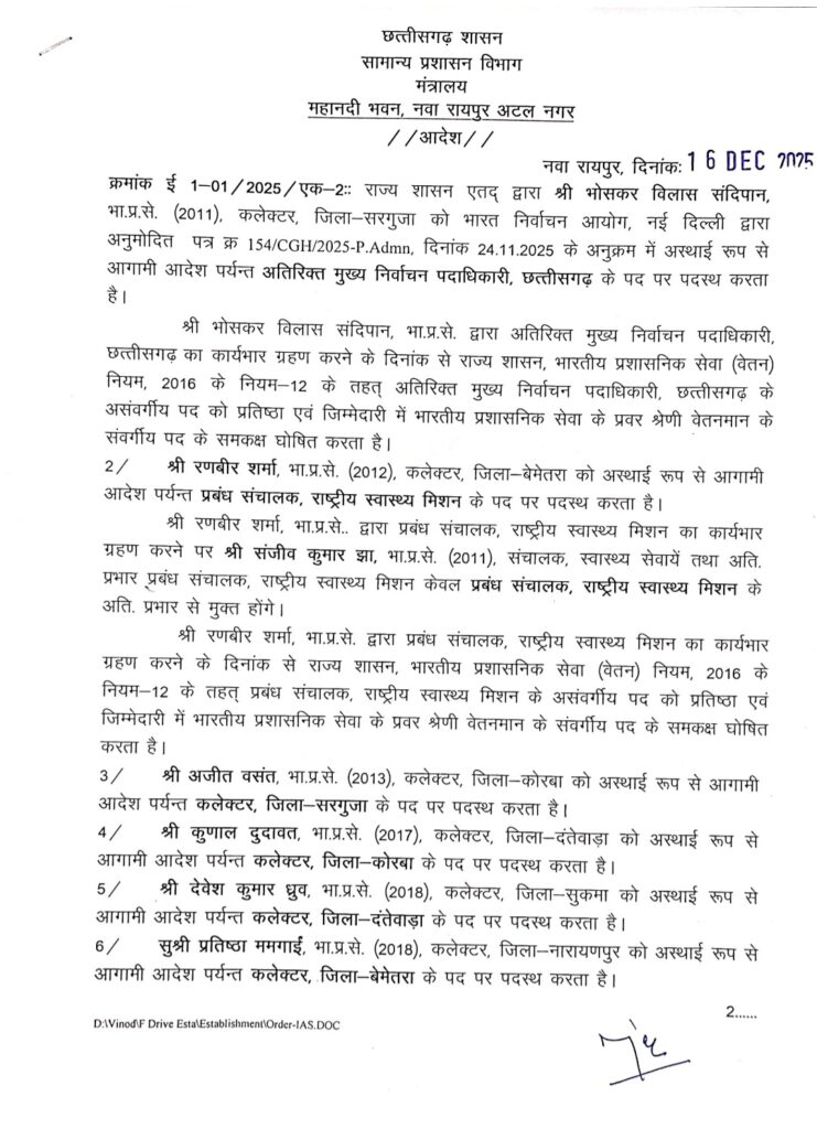रायपुर। छत्तीसगढ़ में शीतकालीन विधानसभा सत्र के दौरान राज्य सरकार ने बड़ा प्रशासनिक कदम उठाते हुए भारतीय प्रशासनिक सेवा (IAS) के 11 अधिकारियों का तबादला कर दिया है। इस फेरबदल में सरगुजा, बेमेतरा, कोरबा, दंतेवाड़ा, सुकमा और नारायणपुर जैसे महत्वपूर्ण जिलों के कलेक्टर बदले गए हैं।