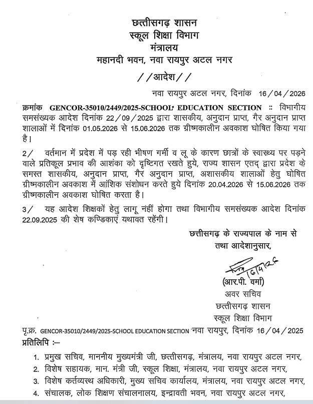 रायपुर। छत्तीसगढ़ में लगातार बढ़ती गर्मी को देखते हुए राज्य सरकार ने बड़ा फैसला लिया है। Vishnu Deo Sai ने सभी शासकीय और निजी स्कूलों में 20 अप्रैल से ग्रीष्मकालीन अवकाश घोषित कर दिया है।